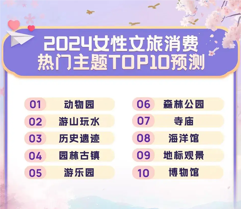《报告》显示,在出游目的地选择方面,2024年女性消费者不仅追“网红”城市,同时也爱历史文化名城。除了追“热门”,女性对于挖掘小众目的地也更有兴趣,安吉、抚远、丹东、宜宾等预计将是今年比较受关注的国内游小众目的地。2024年女性的出境游意愿略高于男性,泰国、日本、新加坡、巴厘岛等将是关注度较高的出境游目的地。