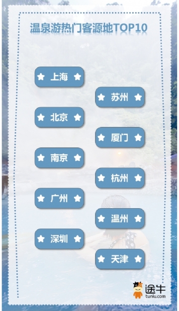 时值12月初,冷空气活动愈发频繁,气温0℃线已跨越秦岭-淮河南北分界线,逐步南下至长江下游附近。随着冬日脚步日益临近,温泉主题旅游产品搜索热度及预订量攀升显著。途牛《2023温泉游消费趋势报告》显示,11月以来,“泡温泉”“温泉门票”“温泉酒店”“私汤温泉”等关键词搜索量较10月同期增长超2倍,温泉游产品预订量增长显著。