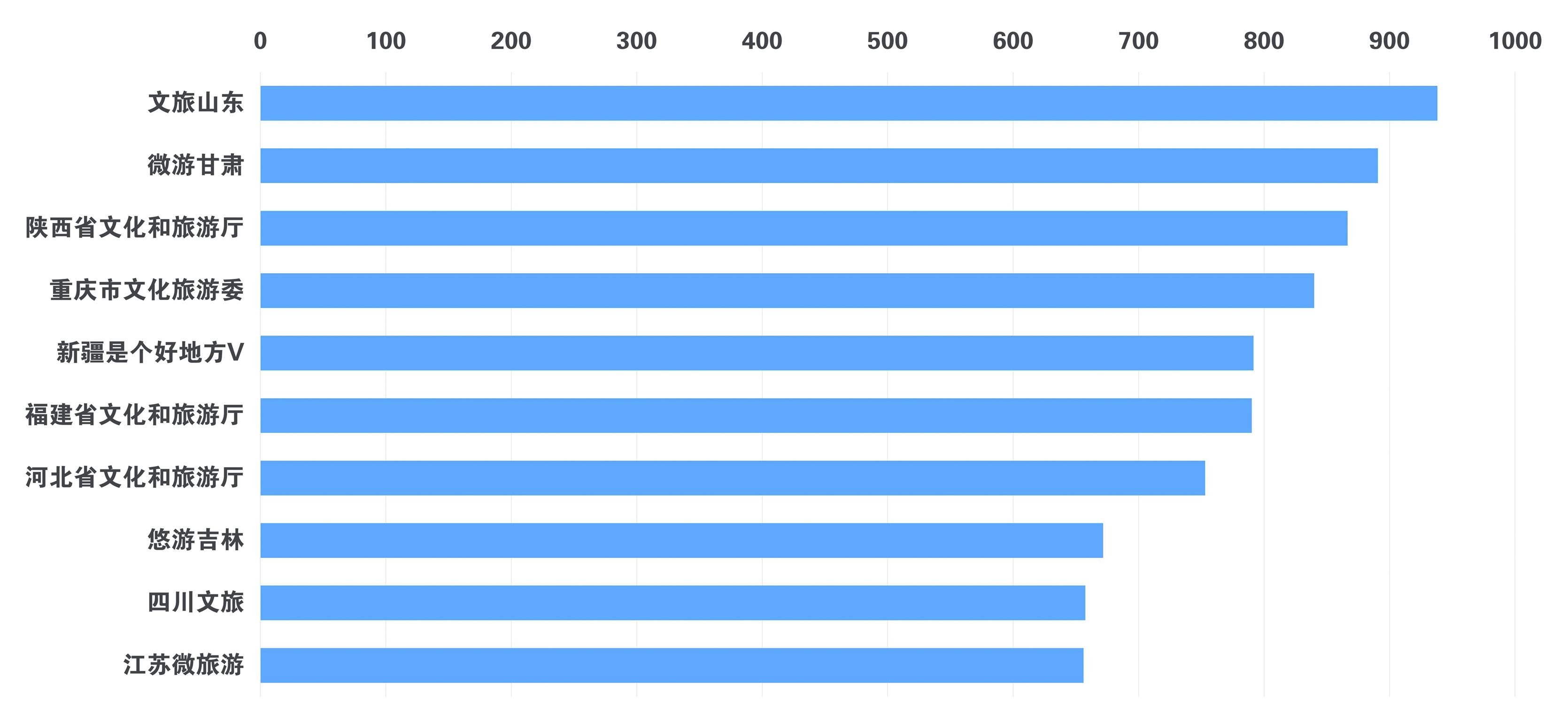 7月,省级文化和旅游政务微博传播力指数排在前列的为:文旅山东、微游甘肃、陕西省文化和旅游厅、重庆市文化旅游委、新疆是个好地方V、福建省文化和旅游厅、河北省文化和旅游厅、悠游吉林、四川文旅、江苏微旅游。监测时间范围内,文旅山东共发布微博1005条,转发19723次,评论47367条,总点赞数15.1万次。其中,原创微博998条,被转发19723次,评论47353条。