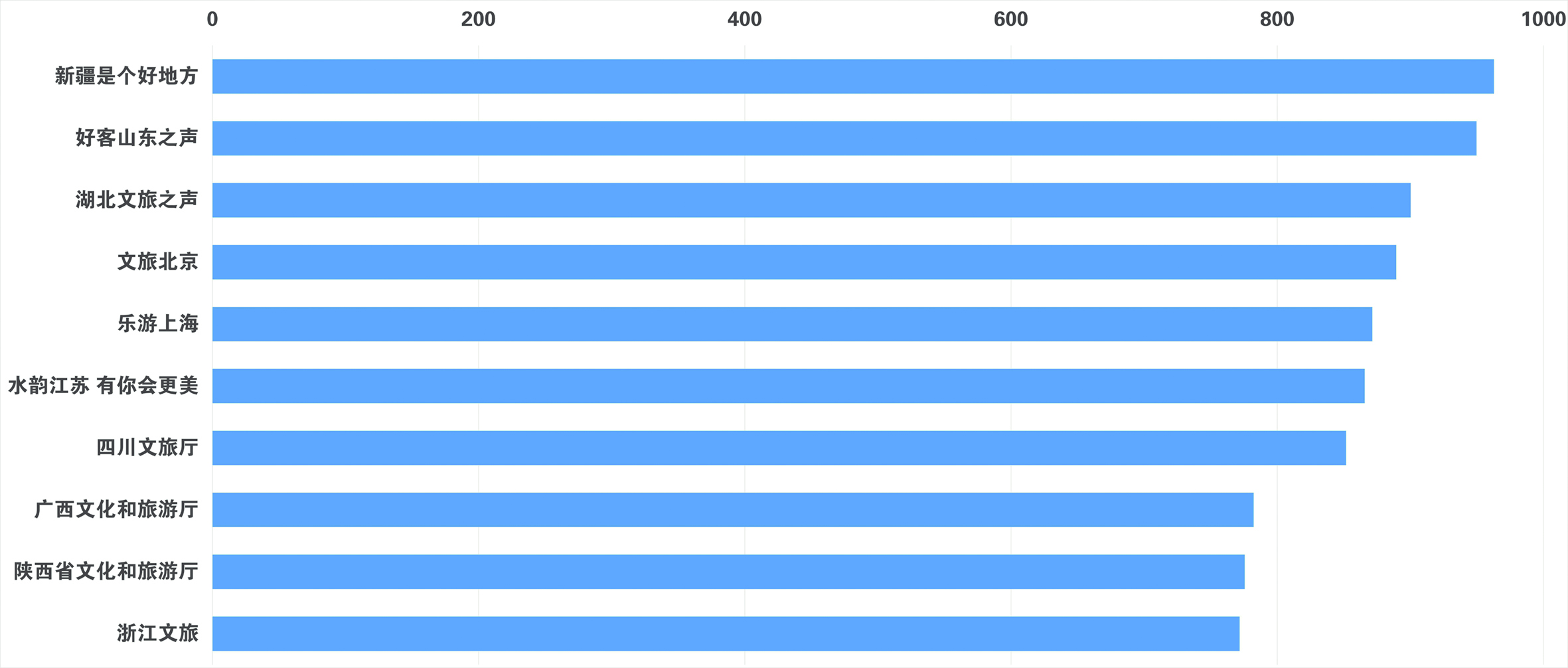 从7月各省级文化和旅游行政部门微信公众号的表现来看,排在前列的为:新疆是个好地方、好客山东之声、湖北文旅之声、文旅北京、乐游上海、水韵江苏 有你会更美、四川文旅厅、广西文化和旅游厅、陕西省文化和旅游厅、浙江文旅。监测时间范围内,新疆是个好地方共发布文章109篇,总阅读量46.9万次,总点赞数7746次。